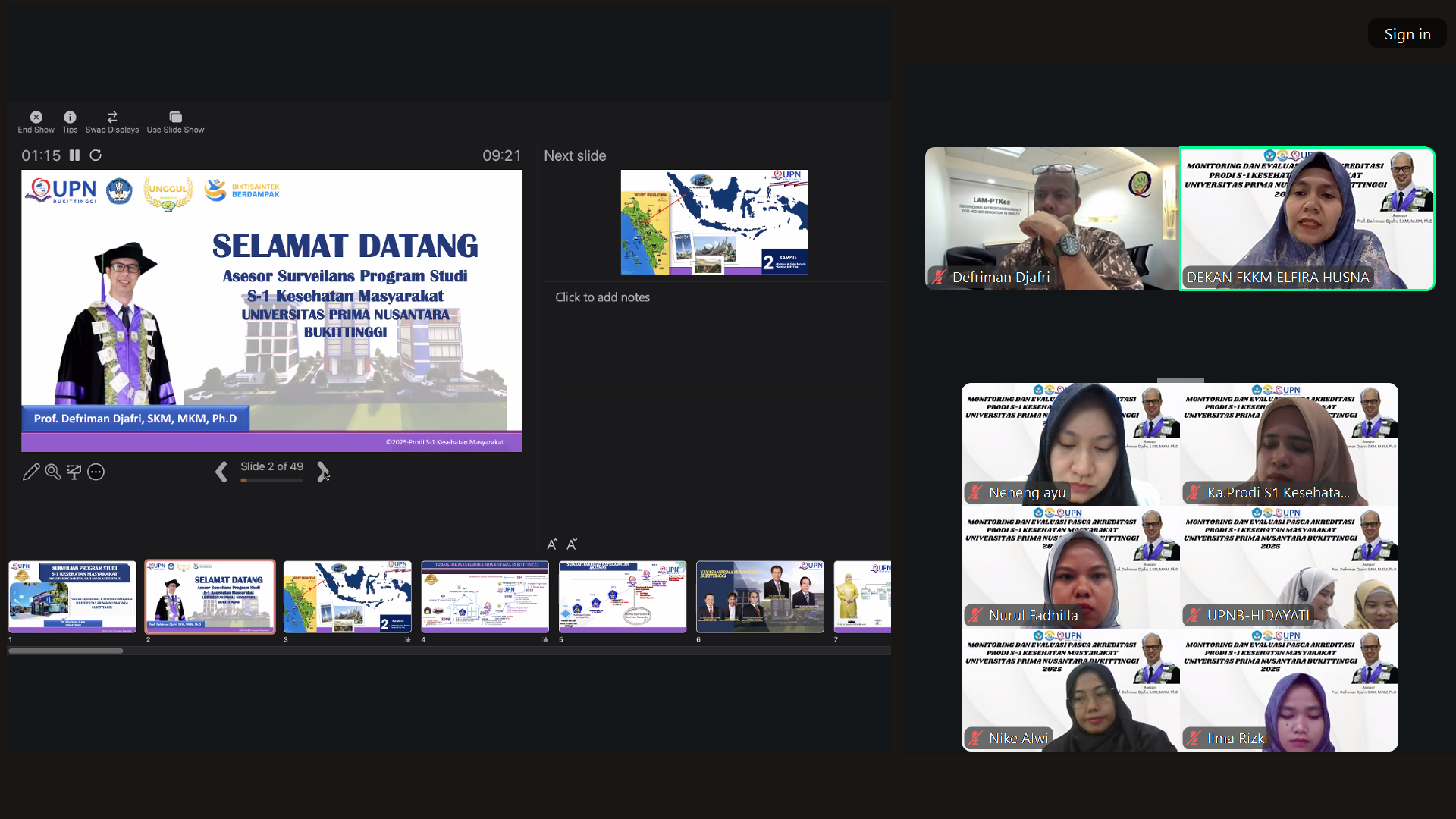 Program Studi S1 Kesehatan Masyarakat Fakultas Kesehatan dan Keperawatan Masyarakat (FKKM) Universitas Prima Nusantara Bukittinggi melaksanakan kegiatan Surveilance Akreditasi secara daring pada hari Rabu, 5 November 2025 pukul 09.00 WIB hingga selesai. Kegiatan ini dipimpin oleh tim asesor Prof. Defriman Djafri, SKM, MKM, Ph.D dari Lembaga Akreditasi Mandiri Perguruan Tinggi Kesehatan (LAM-PTKes).