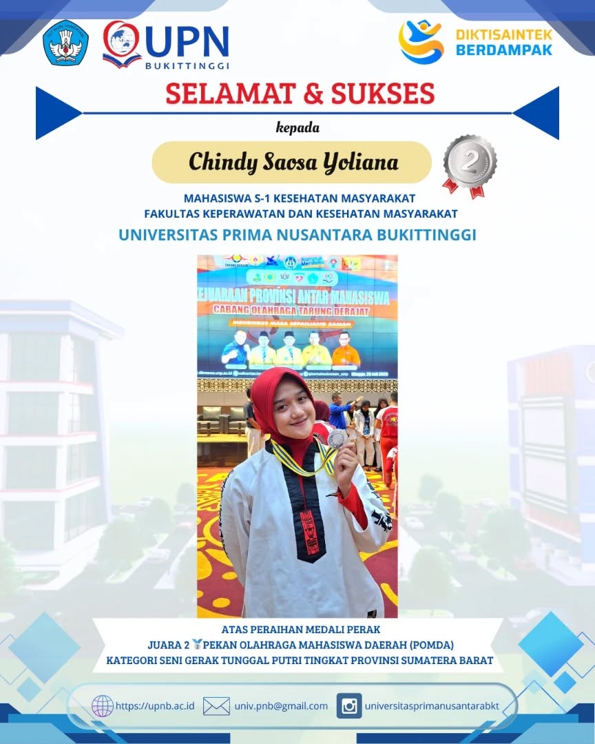 Bangga! Chindy Saosa Yoliana, Mahasiswi S1 Universitas Prima Nusantara Bukittinggi, berhasil meraih medali perak di Kejuaraan Pekan Olahraga Mahasiswa Daerah (POMDA) Tingkat Provinsi Sumatera Barat Tahun 2025!
