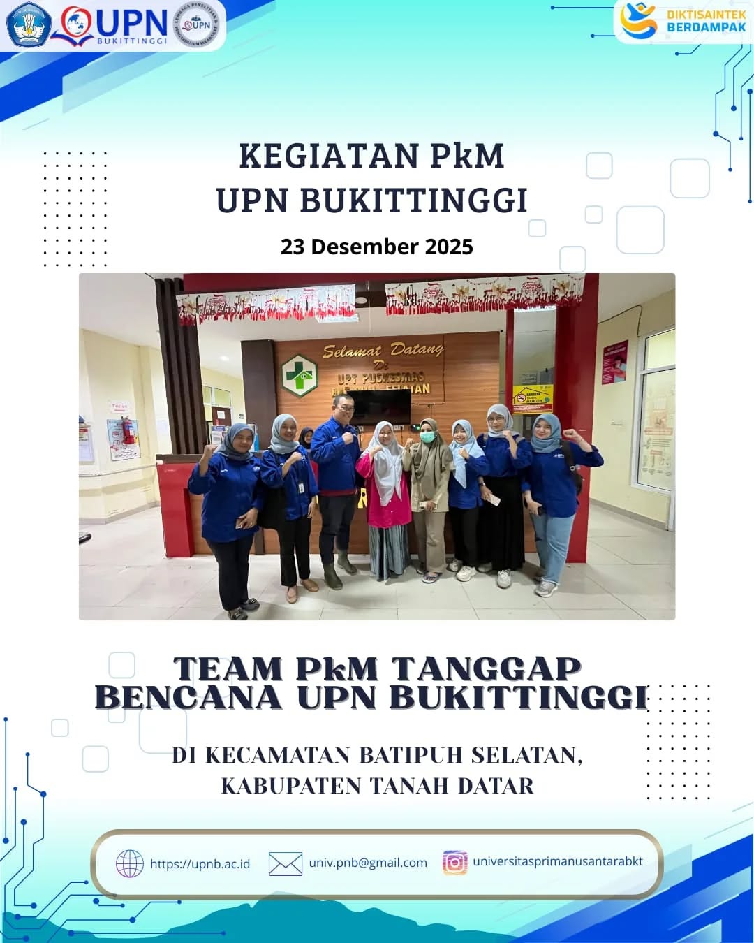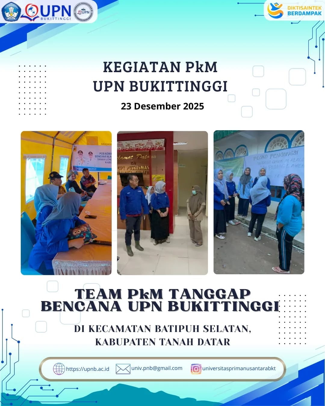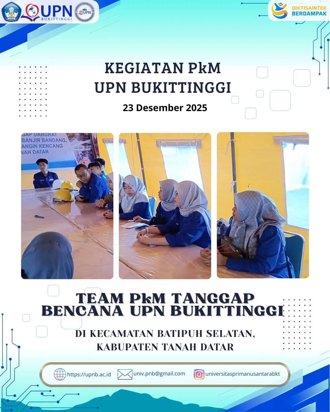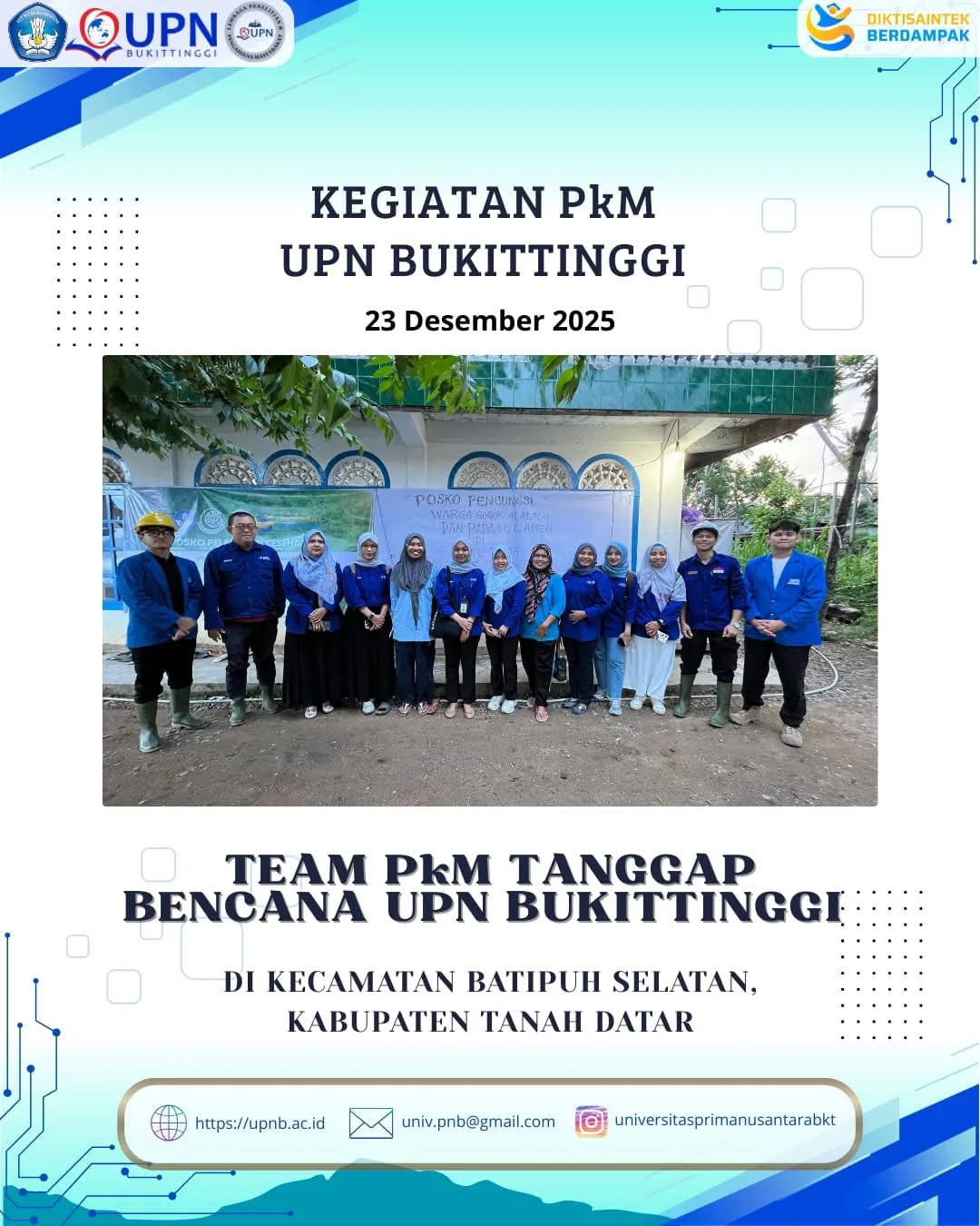 Tanah Datar — Pada Selasa, 23 Desember 2025, Tim Pengabdian kepada Masyarakat (PkM) Universitas Prima Nusantara (UPN) Bukittinggi melaksanakan rangkaian kegiatan Tanggap Darurat Bencana di Kabupaten Tanah Datar, tepatnya di Kecamatan Batipuh Selatan dan Nagari Tanjung Mutiara. Kegiatan ini merupakan wujud kepedulian serta komitmen perguruan tinggi dalam membantu masyarakat yang terdampak bencana.