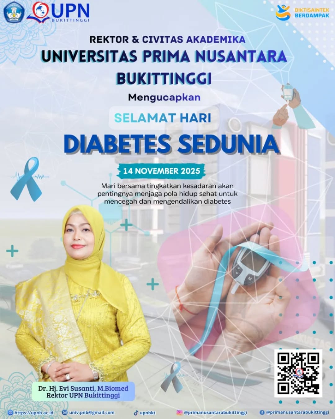 “Diabetes dapat dicegah dengan pengetahuan, kesadaran, dan gaya hidup sehat".Pada momentum Hari Diabetes Sedunia,Universitas Prima Nusantara Bukittinggi mengajak seluruh masyarakat