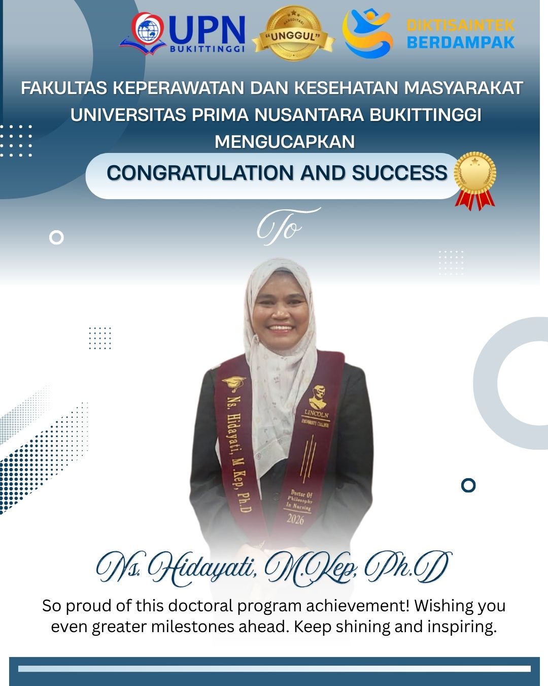 Selamat dan sukses atas pencapaian gelar Doktor Ilmu Keperawatan kepada Ibu Ns. Hidayati, S.Kep, M.Kep, Ph.D. di Universitas Lincoln, Malaysia.