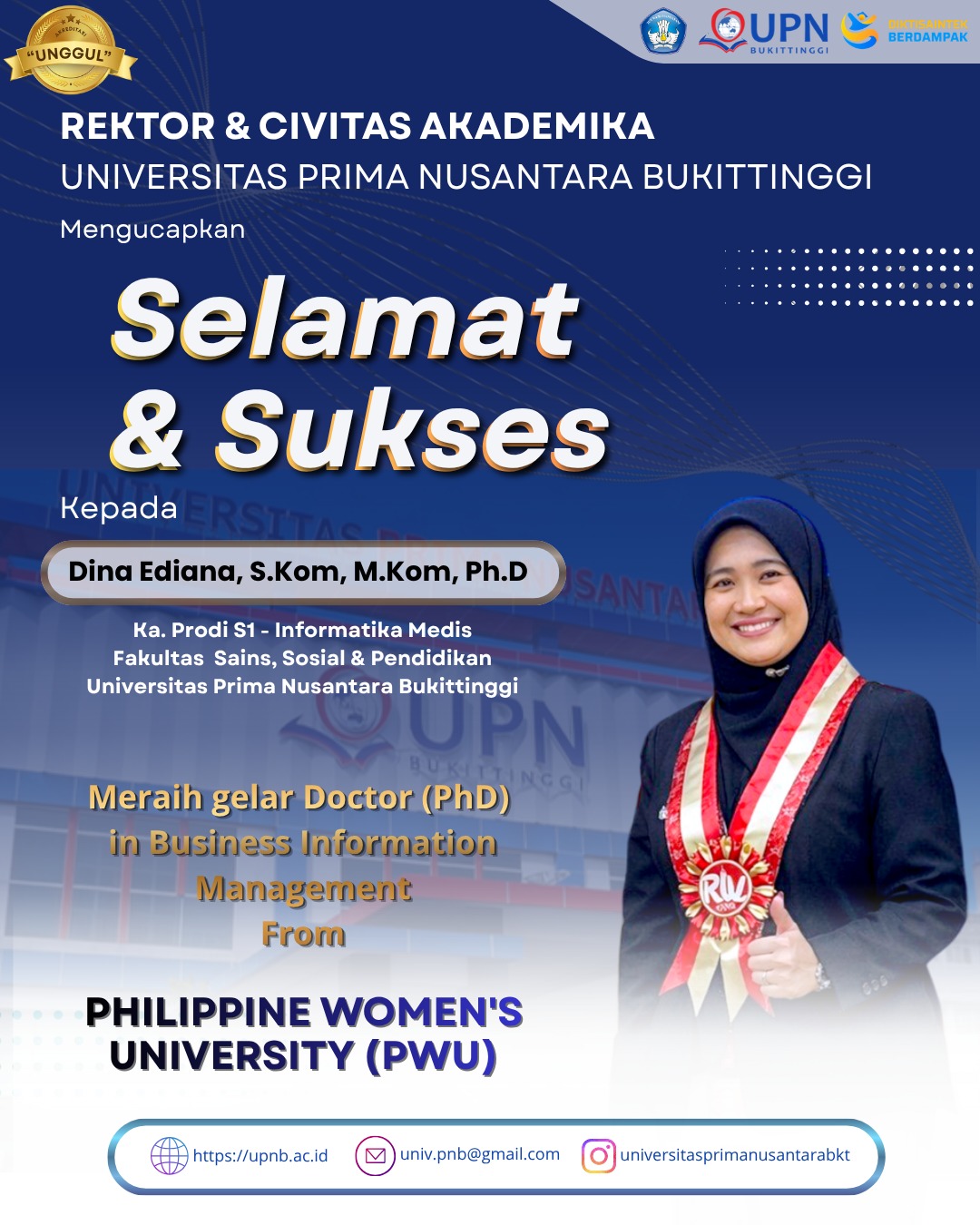 Selamat dan sukses atas pencapaian gelar Doktor (Ph.D) In Business Information Management kepada Dina Ediana, S.Kom, M.Kom, Ph.D From Philippine Women's University (PWU)